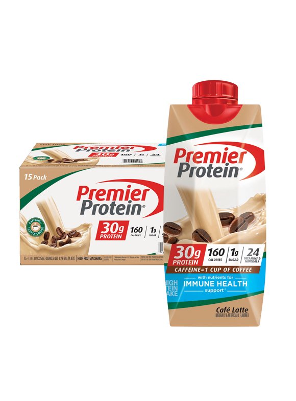 Premier Protein® Cafe Latte High Protein Shake - Harris Teeter Product Details New Café Latte 30g Protein Shake, Caffeine = 1 cup of coffee for energy to start your day. Each low fat shake contains 30g of protein with all the essential amino acids, 160 calories, 1g sugar, 24 vitamins and minerals, and 4g carbs No artificial colors or soy ingredients Gluten-free and Kosher product