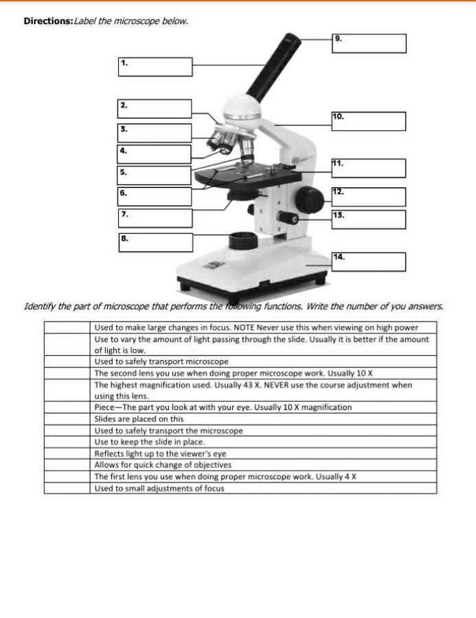 Microscope labeling and functions Flashcards | Quizlet Controls the amount of light passing through the opening of the stage Diaphragm Contains a lens that magnifies about 10x Eyepiece Lens Moves the body tube to focus the image; moves the stage up and down for focusing Coarse Adjustment Knob Moves the body tube slightly to adjust the image; Fine Adjustment Knob Supports the body tube Arm 1.5: Microscopy - Biology LibreTexts On the next page, label the parts of the microscope and list their function. How is a microscope properly carried? How is the microscope properly put away? What is the magnification power of: ... Blank microscope to label parts. This page titled 1.5: Microscopy is shared under a CC BY 4.0 license and was authored, ...