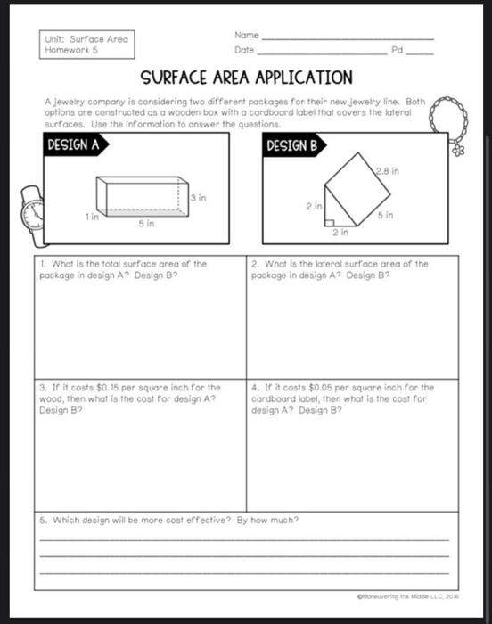 Surface area label. 5.4: Distinguishing Between Surface Area and Volume Surface area is a two-dimensional measure, while volume is a three-dimensional measure. Two figures can have the same volume but different surface areas. ... (five-sided polygon) that has an area of 32 square units. Label all relevant sides or segments with their measurements, and show that the area is 32 square units. (From Unit 1.4.1 ... Surface Area Calculator | Definition | Formulas Surface area is the total area that the surface of the object occupies. In other words, it's the total area of the surface of a 3D object. Sometimes the surface area may be split into a sum of base area (s) and lateral surface area. The lateral surface is the area of all the sides of the object, excluding its base and top. PDF SURFACE AREA AND VOLUME - University of Houston The total surface area is T= L + 2 B= 112 + 2 (15)=142 cm2. b) Assuming that the 3x7 cm rectangles are the bases: The perimeter P of a base is P=+37++37 =20 cm. The height h of the prism is 5 cm. The lateral area of the prism is L= Ph= 20 ()5 =100 cm2. The area of a base is B= 3()7 =21 cm2. How is surface area labeled? - Answers It is the surface area of the two ends plus the surface area of the curved surface. Surface area of each end is pir2 Surface area of the curved surface is 2pirh Total surface...